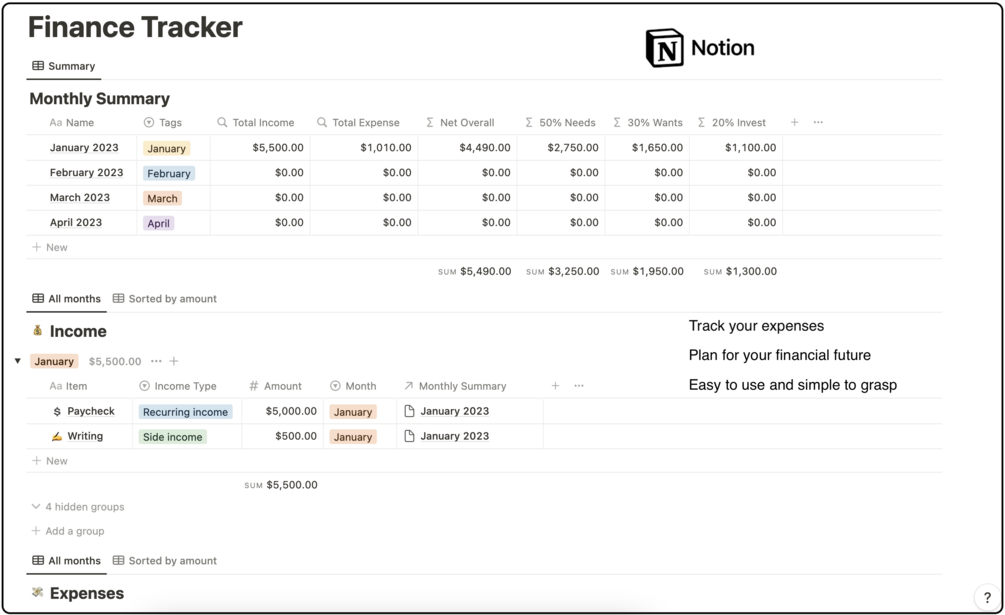 Finance Tracker helps you in managing and planning your monthly finances and divides your money into effective 50/30/20 budgeting rules.